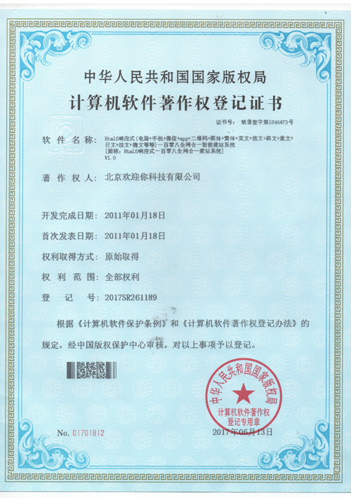 北京歡迎你科技有限公司獲得多項(xiàng)版權(quán)局"計(jì)算機(jī)軟件著作權(quán)登記證書",并已獲得“全國誠信經(jīng)營示范單位”、“全國質(zhì)量服務(wù)客戶滿意誠信企業(yè)”和“全國重合同守信用品牌企業(yè)”等榮譽(yù)稱號(hào)。